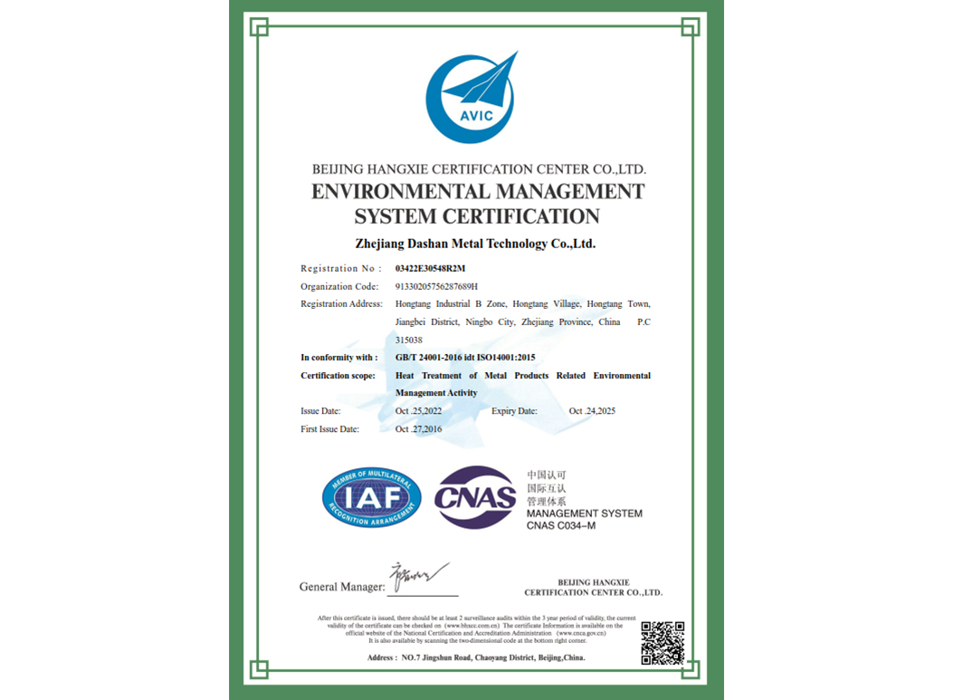 經過近35年來不斷引進先進的熱處理設備和技術,使企業具備了雄厚的產品熱處理工藝開發和生產能力,在熱處理行業中取得了令人矚目的業績,在客戶中建立了良好的口碑。本企業已通過IATF 16949:2016 質量管理體系、GB/T24001-2016 idt ISO14001:2015 環境管理體系、ISO 45001:2018 職業健康安全管理體系認證,正全面貫徹執行相關管理體系標準,為客戶提供更有保證的全面服務。大山愿與各界朋友攜手共進,為提高熱處理質量不斷努力!